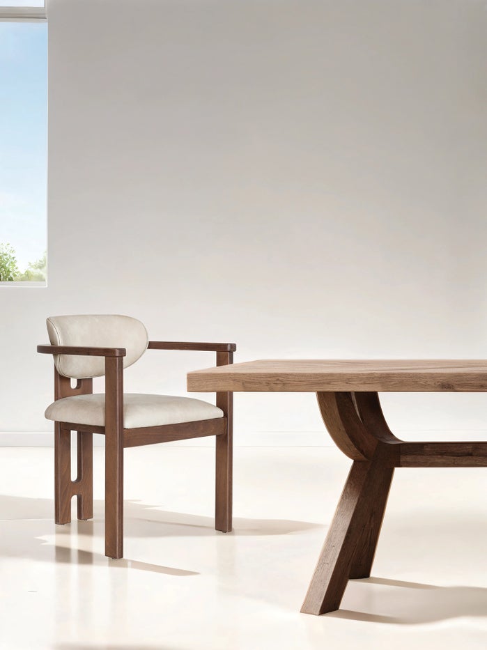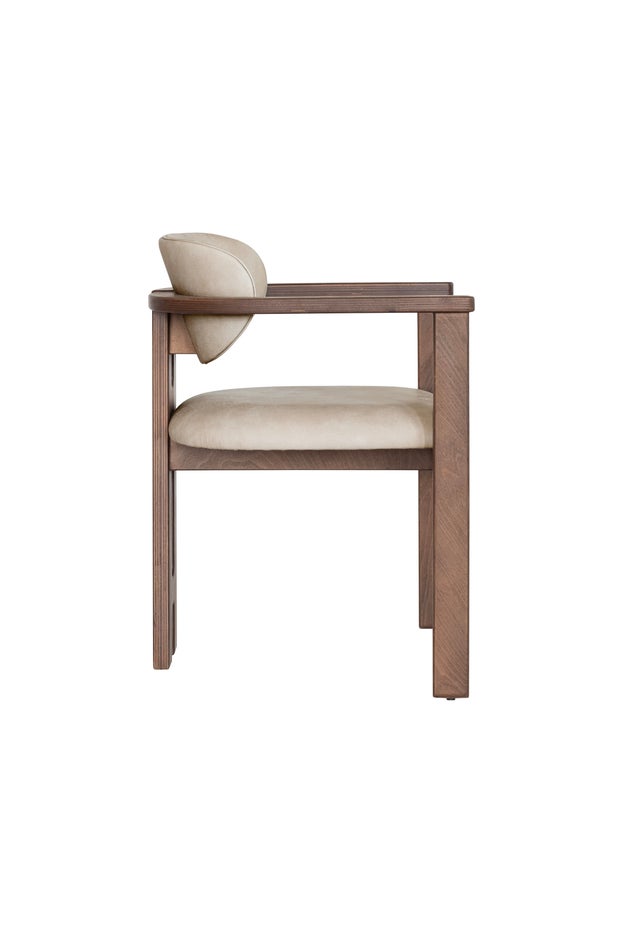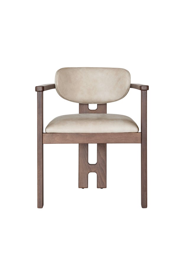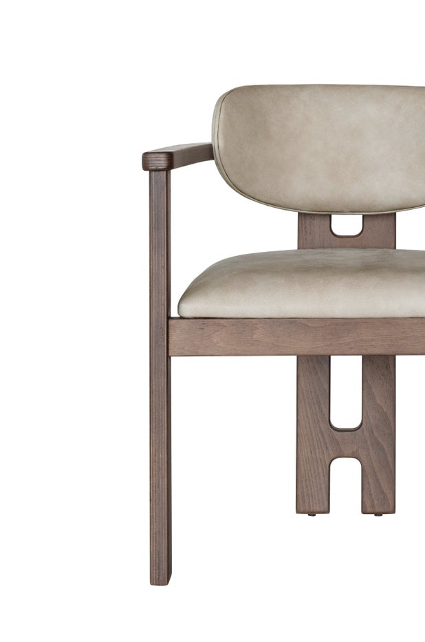 The Porter dining chair from Pure Furniture exemplifies high-quality design and craftsmanship. Its back and arms create a striking silhouette, making it a standout piece in any dining area. Upholstered in supple beige leather, the seat and backrest ensure both comfort and elegance. The frame, in a weathered finish, adds a modern touch. Known for their exceptional quality, Pure Furniture offers a chair that is both functional and stylish.