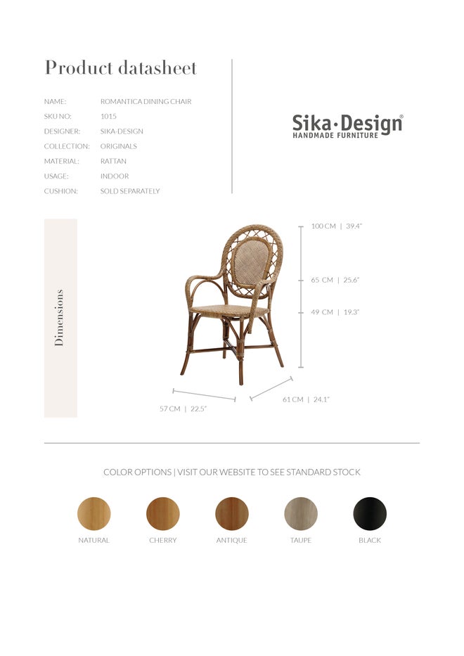 Romantica is a charming wicker chair that showcases Danish design, belonging to Sika-Design's Originals collection. This collection features beautifully crafted wicker furniture, all designed by Sika-Design. The unique and detailed windings of the Romantica chair provide a romantic touch, making it a cosy addition to any home setting. It’s suitable for a variety of spaces, including conservatories, cottages, hotels, and indoor restaurants. Handmade from sustainable Indonesian rattan, the chair’s seat and backrest are meticulously woven by skilled wicker makers. Indonesian rattan is renowned for its sustainability and strength, ensuring that this furniture can endure for generations while maintaining its aesthetic appeal.