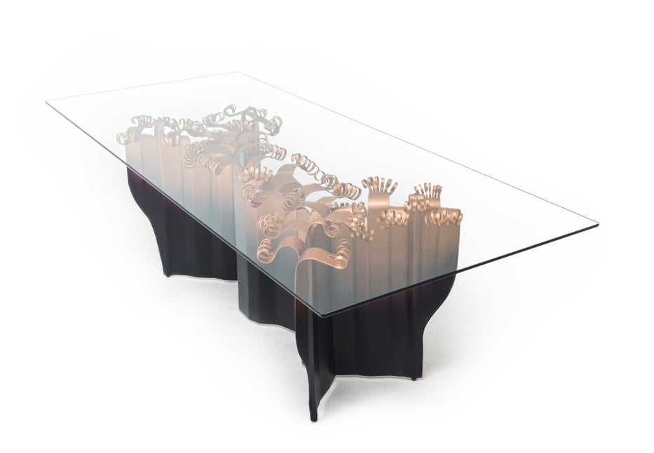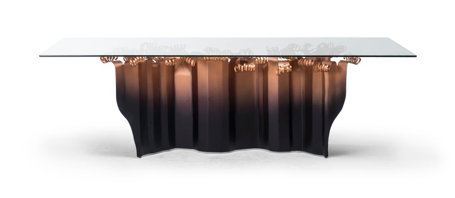 The Vivo collection from Kenneth Cobonpue features elegant forms crafted from hand-bent metal sheets, inspired by the age-old tradition of fine jewellery making. The striking antique copper finish enhances the intricate filigree, showcasing a harmonious balance between pure design and artisanal craftsmanship. This collection exemplifies the perfect fusion of artistic expression and functional beauty, making it a standout choice for any modern space.