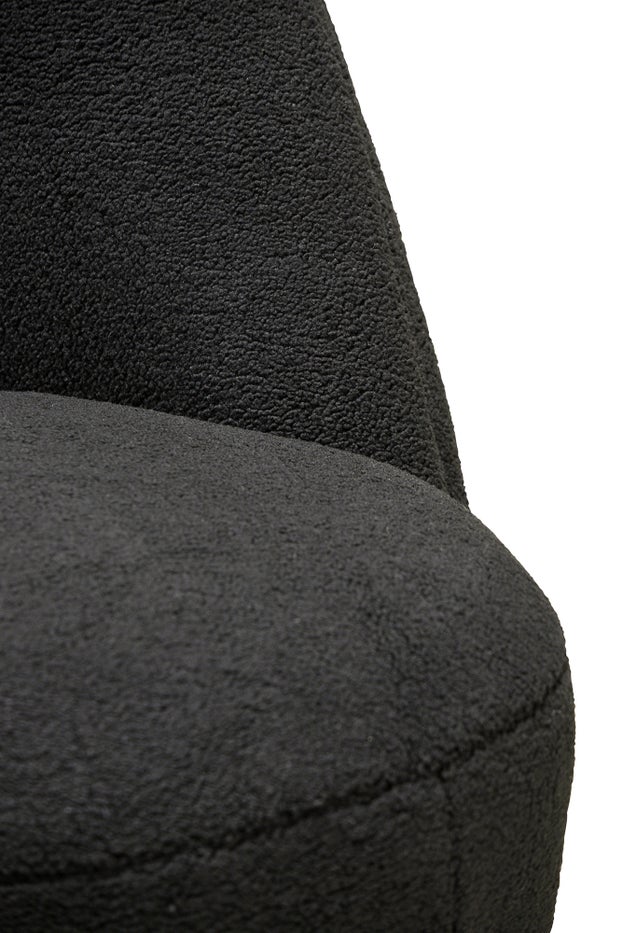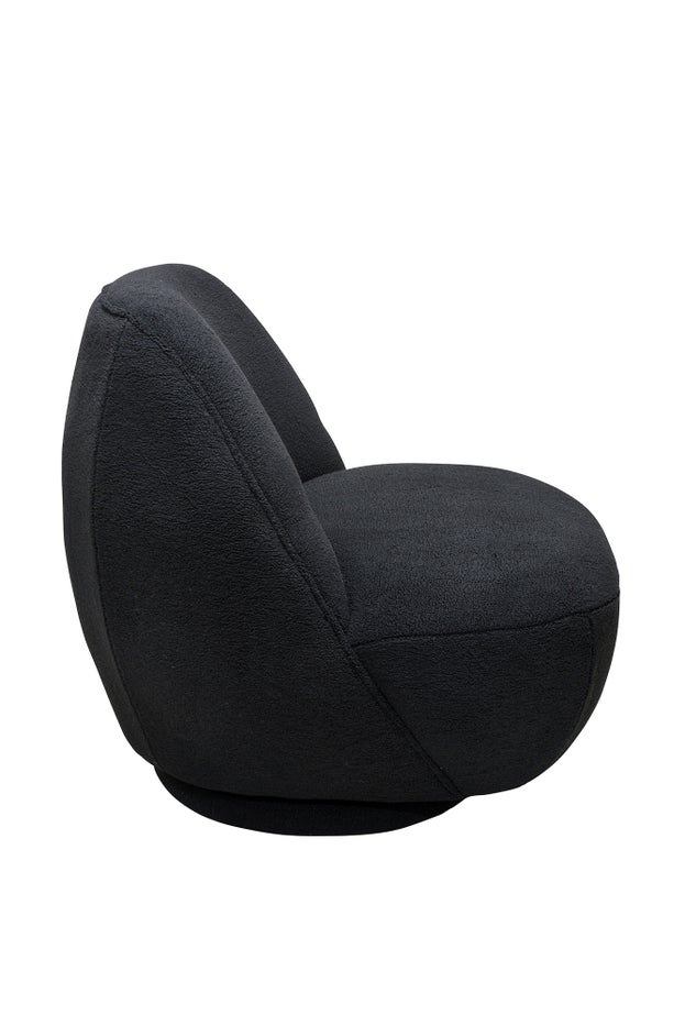 Part of the Baxter collection, the Tobias swivel chair is designed to fit a variety of spaces. Its understated style and warm colour make it a welcoming addition to any room. Upholstered in an ever-popular black Shearling, the Tobias offers a soft texture that enhances comfort and invites relaxation. With a hidden swivel base, this occasional chair combines practicality with style, making it an excellent choice for those seeking both functionality and aesthetic appeal.