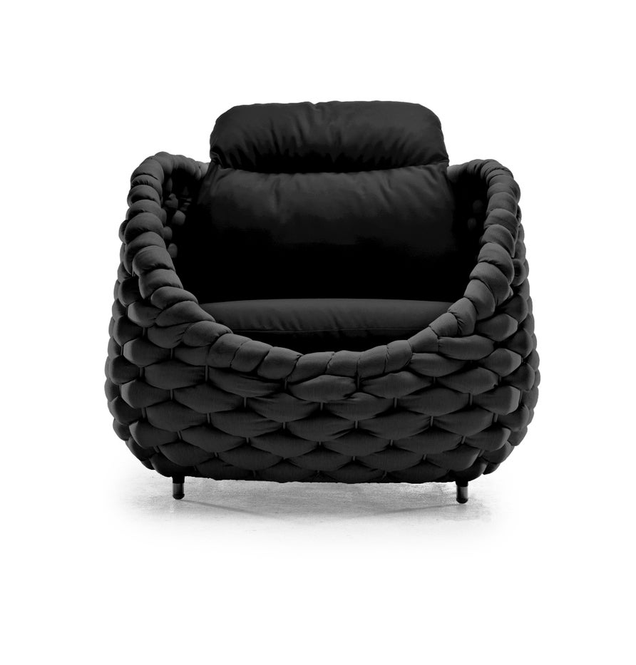 Settle into Rapunzel from Kenneth Cobonpue and let a story emerge from beneath the fine wool braids. Thick hand-coiled upholstered foam curves over a steel frame. With Muslin covered upholstery & fabric. Colours available: Midnight / Pearl