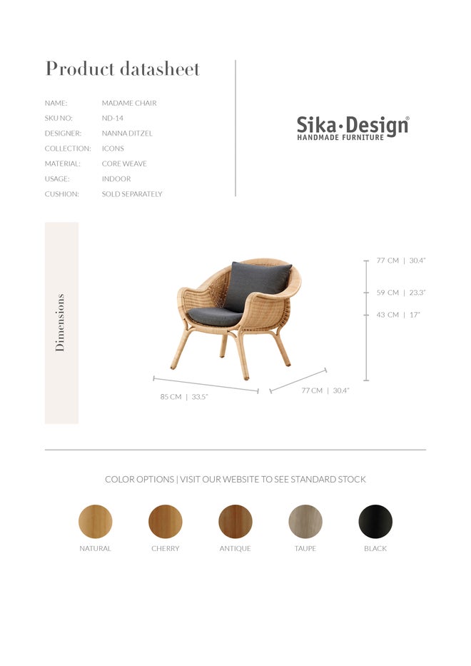 The exclusive Icons collection by Sika Design represents pieces by renowned architects and designers who have great respect and admiration for the original designs, and who work in close collaboration with the descendants of Sika Designs original artisans. Madame is an elegant lounge chair designed in 1951 by Nanna Ditzel and her husband, Jørgen Ditzel. The couple's experimental approach to materials resulted in the shell shape with its soft and feminine shapes - hence the name Madame chair.