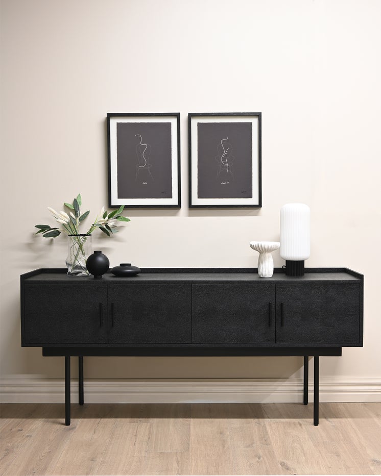 The Bennett Sideboard from the Clarence Collection is a striking and functional piece of furniture. Designed with soft-close doors for a seamless user experience, it is finished in elegant black shagreen, complemented by a refined black linen top. A subtle lip around the back and sides of the top enhances its design while adding practicality. Whether used in a dining room, living space, or hallway, the Bennett Sideboard combines bold style with everyday functionality, making it a versatile addition to your home. The Clarence collection, designed by May Time, is a testament to refined craftsmanship and versatility. Each piece in this eco-friendly, durable range is meticulously hand-finished in multiple premium materials, showcasing skilled artisanship and attention to detail. With its rich textures and contemporary style, the Clarence collection is suitable for both private and commercial spaces, adding lasting elegance to any interior.