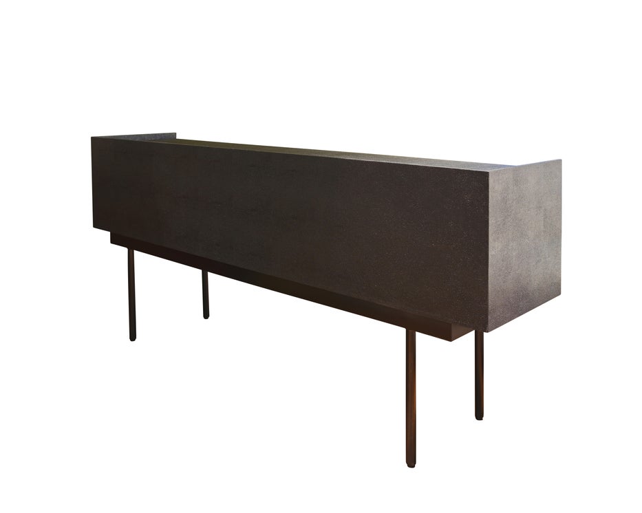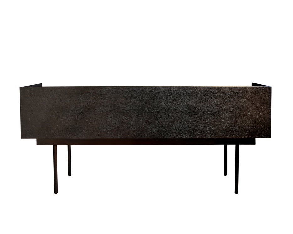 W1700 D400 H760 Black Linen resin top, black Shagreen resin body, black metal legs 4 soft close doors Lip around the back and sides of the top