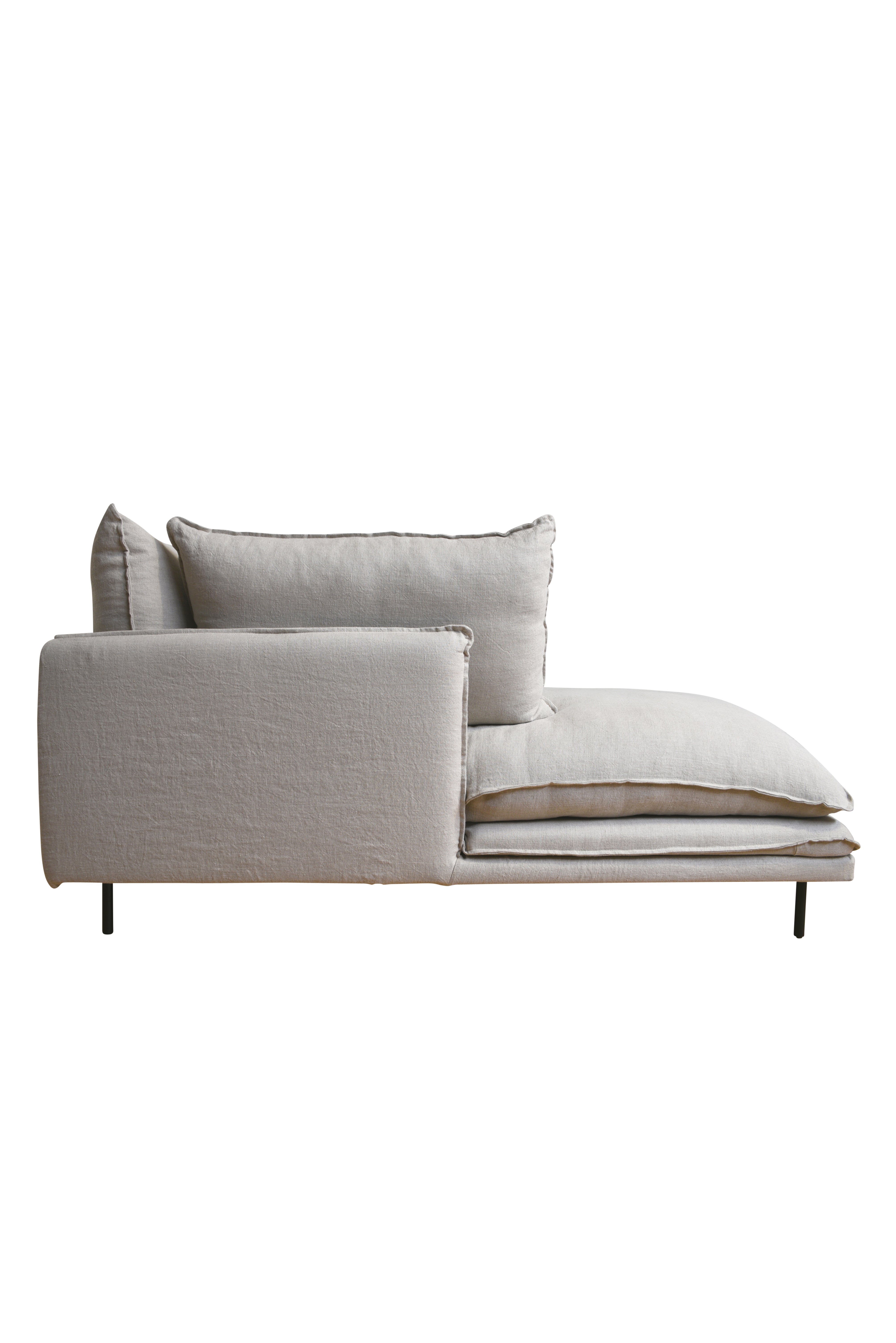 W900 D1800 H800 Cover: 100% Linen Seat Cushion: 33% Fiber, 34% high Density Fiber, 33% Crush Foam Back Cushion: 80% High Density Fiber, 20% Crush Foam Frame: Pine and Engineered Wood