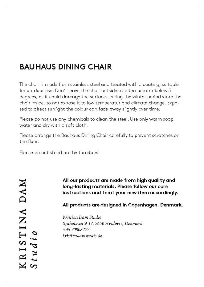The Bauhaus Dining Chair is made from stainless steel and treated with a powder-coating. The product is suitable for outdoor use. Don´t leave the chair outside at temperatures below 5 degrees celcius, as it might damage the surface coating. Store the chair indoor during the winter season. Exposed to direct sunlight the colour might fade slightly over time. Use only warm soap water when cleaning the product and dry with a soft cloth. Please arrange the Bauhaus Dining Chair carefully to prevent scratching the powder-coating or the floor. Please do not stand on the furniture! This product is tested and proved for the contract market.