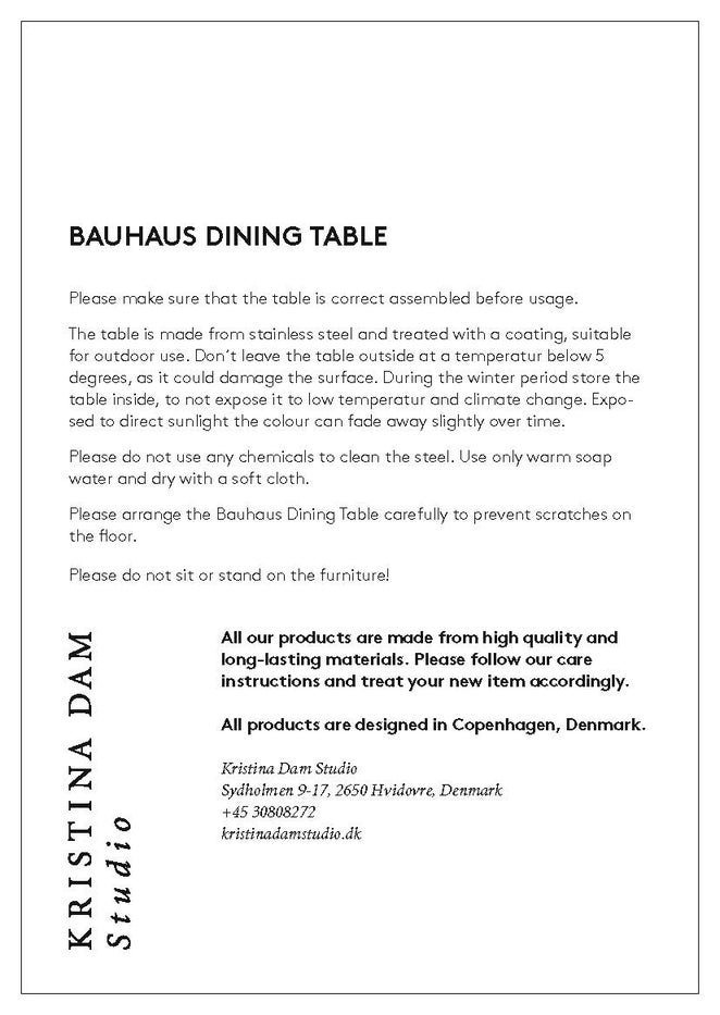 Please make sure that the table is correct assembled before usage. The Bauhaus Dining Table is made from stainless steel and treated with a powder-coating. The product is suitable for outdoor use. Don´t leave the table outside at temperatures below 5 degrees celcius, as it might damage the surface coating. Store the table indoor during the winter season. Exposed to direct sunlight the colour might fade slightly over time. Use only warm soap water when cleaning the product and dry with a soft cloth. Please arrange the Bauhaus Dining Table carefully to prevent scratching the powder-coating or the floor. Please do not stand on the furniture! This product is tested and proved for the contract market.