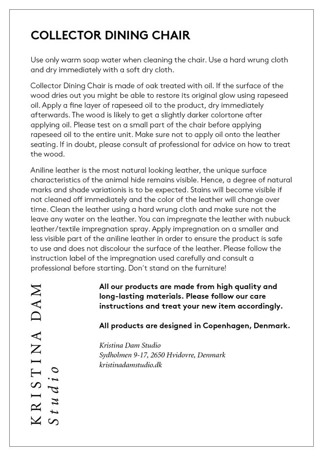 Use only warm soap water when cleaning the chair. Use a hard wrung cloth and dry immediately with a soft dry cloth. Collector Dining Chair is made of lacquered Oak. If the surface of the wood dries out you might be able to restore its original glow using rapeseed oil. Apply a fine layer of rapeseed oil to the product, dry immediately afterwards. The wood is likely to get a slightly darker colortone after applying oil. Please test on a small part of the chair before applying rapeseed oil to the entire unit. Make sure not to apply oil onto the leather seating. If in doubt, please consult a professional for advice on how to treat the wood. Aniline leather is the most natural looking leather, the unique surface characteristics of the animal hide remains visible. Hence, a degree of natural marks and shade variationis is to be expected. Stains will become visible if not cleaned off immediately and the color of the leather will change over time.