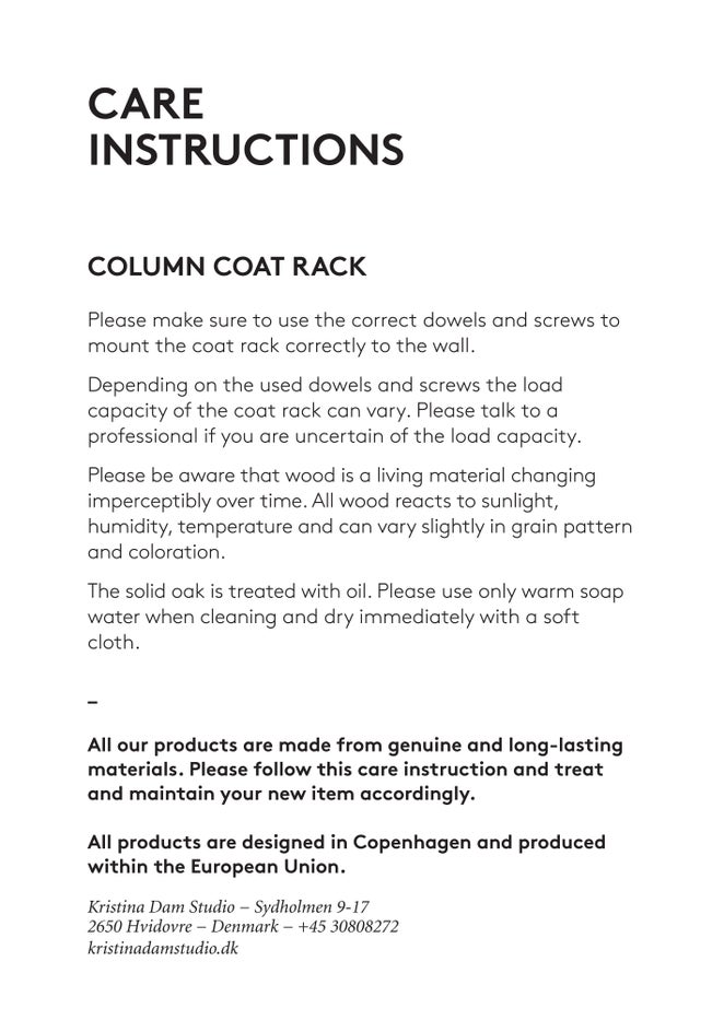 Use the correct dowels and screws to mount the coat rack correctly to the wall. If exposed to direct sunlight the colour may fade slightly over time. Use only warm soap water when cleaning and dry immediately with a soft cloth. All wood reacts to sunlight, humidity, temperature and can vary slightly in grain pattern and colouration.