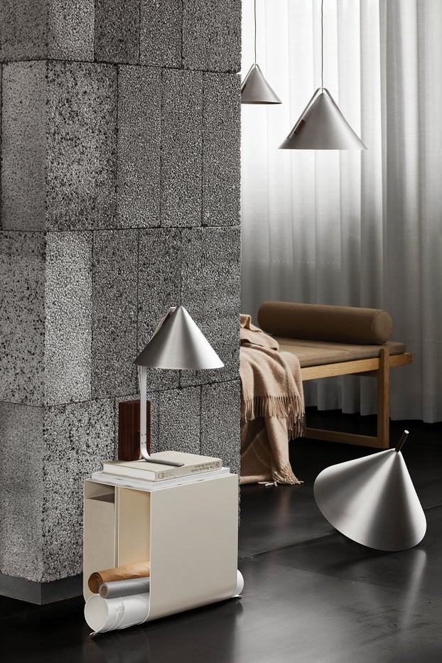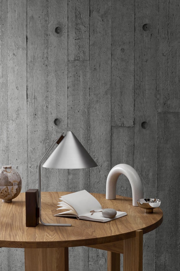 The Cone Table Lamp from Kristina Dam Studio is crafted from contrasting materials, solid walnut, brushed aluminum and purposeful geometric shapes. A highly sculptural lamp for modern and bold interiors, the cool aluminum cones and warmth of the wooden details is a minimalist contrast done right. The Cone Lamp series ties on the geometric shape that tapers smoothly from a circular base to the apex point.
