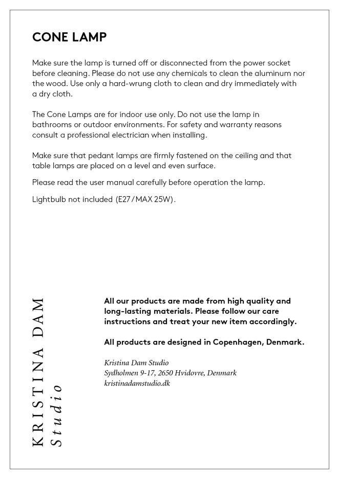 Make sure the lamp is turned off or disconnected from the power socket before cleaning. Please do not use any chemicals to clean the aluminum nor the wood. Use only a hard-wrung cloth to clean and dry immediately with a dry cloth. The Cone Lamps are for indoor use only. Do not use the lamp in bathrooms or outdoor environments. For safety and warranty reasons consult a professional electrician when installing. Make sure that pedant lamps are firmly fastened on the ceiling and that table lamps are placed on a level and even surface. Please read the user manual carefully before operation the lamp.