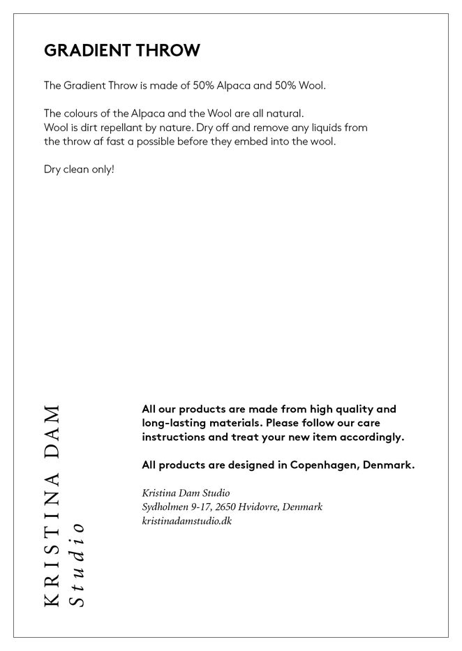 The Gradient throw, from Kristina Dam Studio is a soft woolen throw with a minimalistic graphic design. Crafted from 50% natural New Zealand wool and 50% alpaca wool, the warm throw is delightfully soft. Produced in Silkeborgs Uldspinderi, which is a wool spinning mill in Jutland Denmark, the Gradient throw is a beautiful addition to any bed or sofa.
