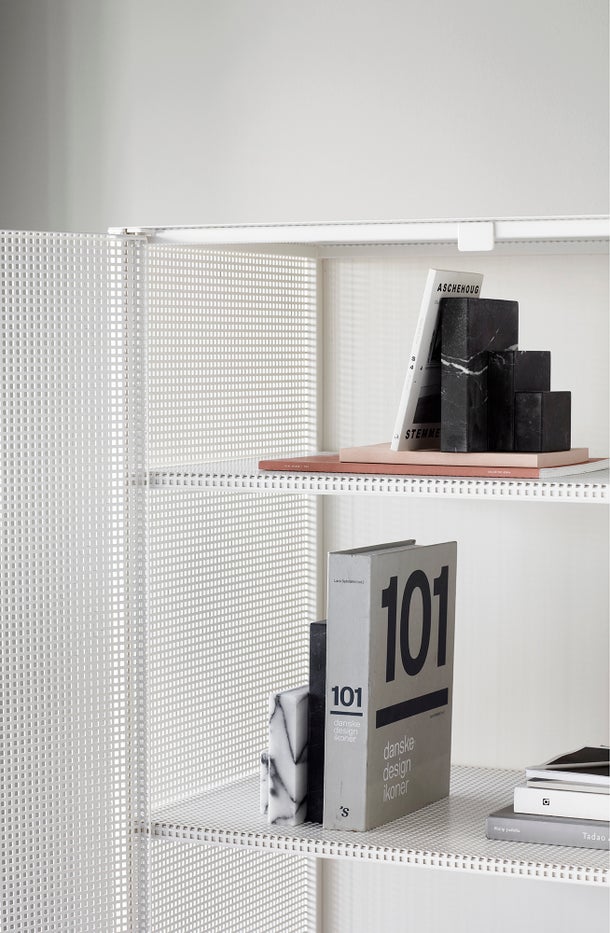 The Grid cabinet from Kristina Dam Studio is made of perforated steel and is perfect for storing books, objects or dishes. The see-through doors and sides keep the piece looking light while allowing a glimpse of the pieces that are stored inside. The cabinet comes with three perforated steel shelves and the cabinet doors swing outwards from the center when opened and are closed with a strong magnetic lock. Made from beautiful black perforated powder coated steel.