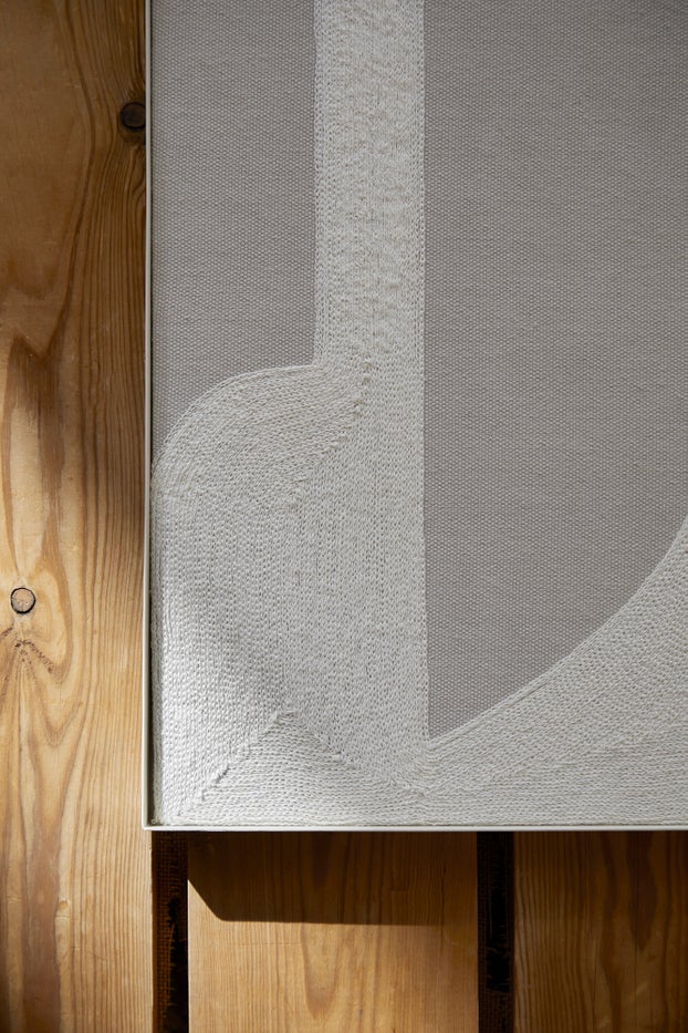 The Relief Artworks’ patterns are graphic abstractions from large paintings. The artworks create a unit and function as single or paired. The tone-in-tone-coloured cotton embroideries on canvas in powder coated frames add a tactile feeling to contemporary spaces.