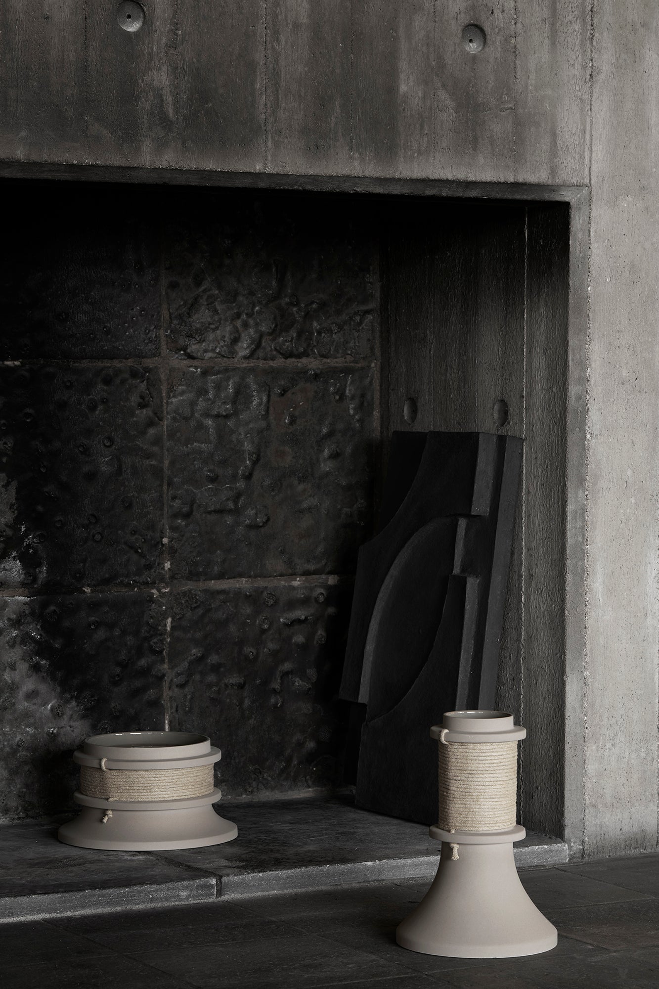 The Rope Vase & Flowerpot accentuate the appeal of merging materials – beige englobed stoneware and halyard – and sculptural and imminent shapes. The two large centrepieces in earthy tones add character to the space they inhabit with or without a solitaire flower.