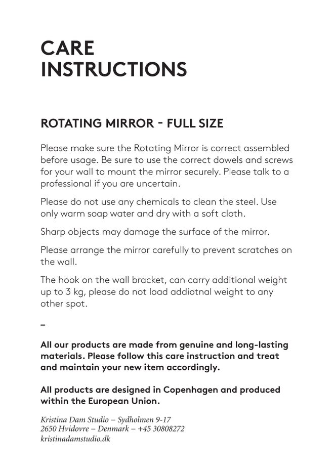 Assemble correctly by using the assembly instructions provided. Use the correct dowels and screws for your wall to securely mount to the wall - consult a professional if you are uncertain. Use only warm soap water and glass cleaner for the mirror and dry with a soft cloth. Do not use chemicals. The Rotating Mirror is not made to carry any additional weight.