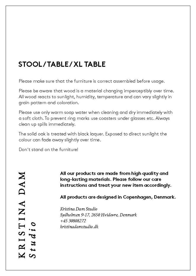 Please make sure that the furniture is correct assembled before usage. Please be aware that wood is a material changing imperceptibly over time. All wood reacts to sunlight, humidity, temperature and can vary slightly in grain pattern and coloration. Please use only warm soap water when cleaning and dry immediately with a soft cloth. To prevent ring marks use coasters under glasses etc. Always clean up spills immediately. Don´t stand on the furniture!
