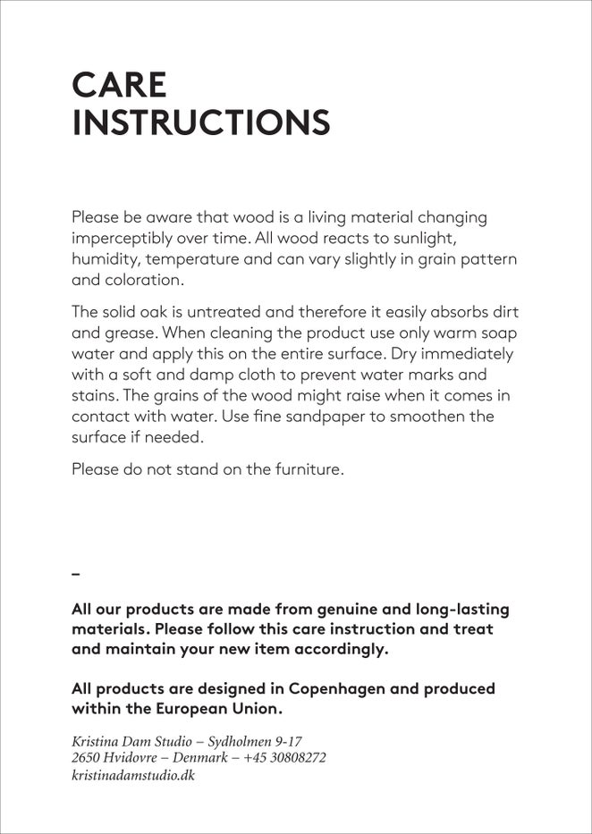 Please make sure that the furniture is correct assembled before usage. Please be aware that wood is a material changing imperceptibly over time. All wood reacts to sunlight, humidity, temperature and can vary slightly in grain pattern and coloration. Please use only warm soap water when cleaning and dry immediately with a soft cloth. To prevent ring marks use coasters under glasses etc. Always clean up spills immediately. Don´t stand on the furniture!
