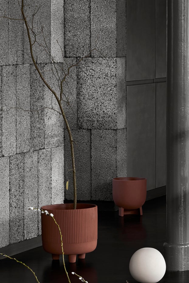 The three legged bowl from Kristina Dam Studio is an eye-catching piece. All bowls in the assortment are made from terracotta with a grey slip (engobe) and the interior is glazed and water resistant. The exterior of the bowl features a textured band, impressed into the clay.