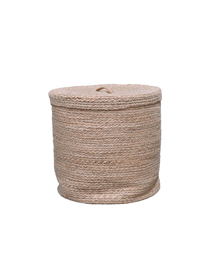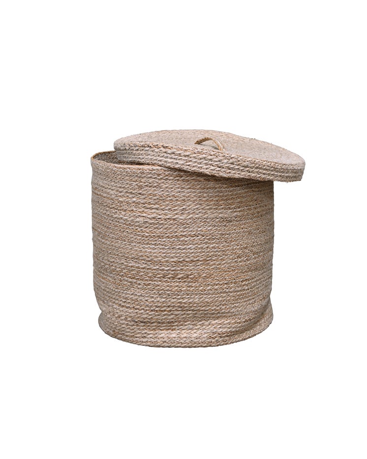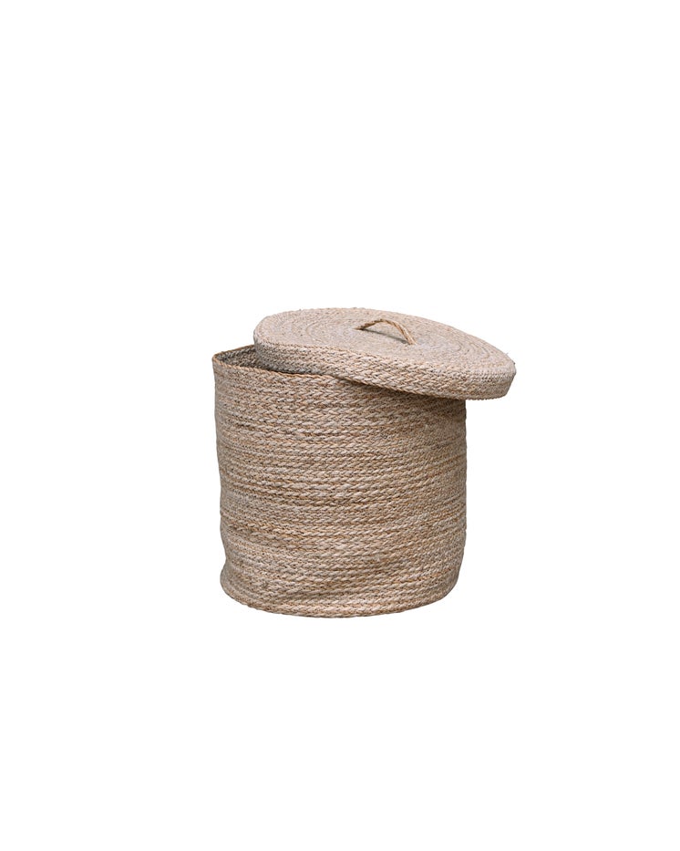 Handcrafted in village homes across Bangladesh, this set of two nesting baskets offers both practicality and charm. Each basket comes with a lid featuring a woven handle, making them perfect for storing blankets, laundry, or other household items. Individually handmade, every piece is unique, showcasing the exceptional craftsmanship of Bangladeshi artisans. These baskets are a stylish and functional addition to any home, combining utility with timeless appeal.