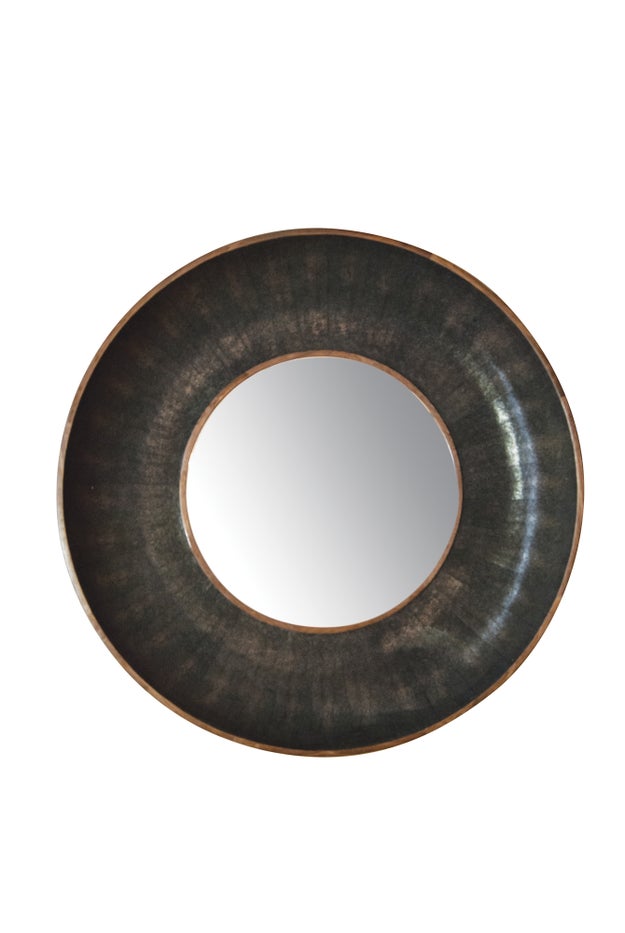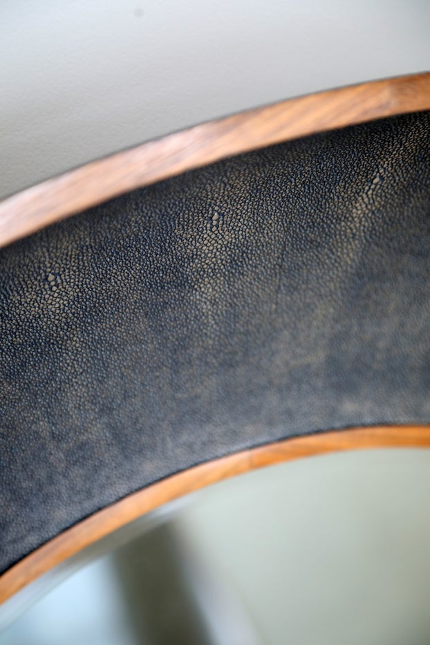 A May Time classic - the CLARENCE Dish mirror of Shagreen resin. A statement piece for entrance halls, living rooms or studies. With a textured seal look, the Dish mirror draws the eye to the fine craftsmanship and detailed attention paid to the finishing of Shagreen meeting Walnut.