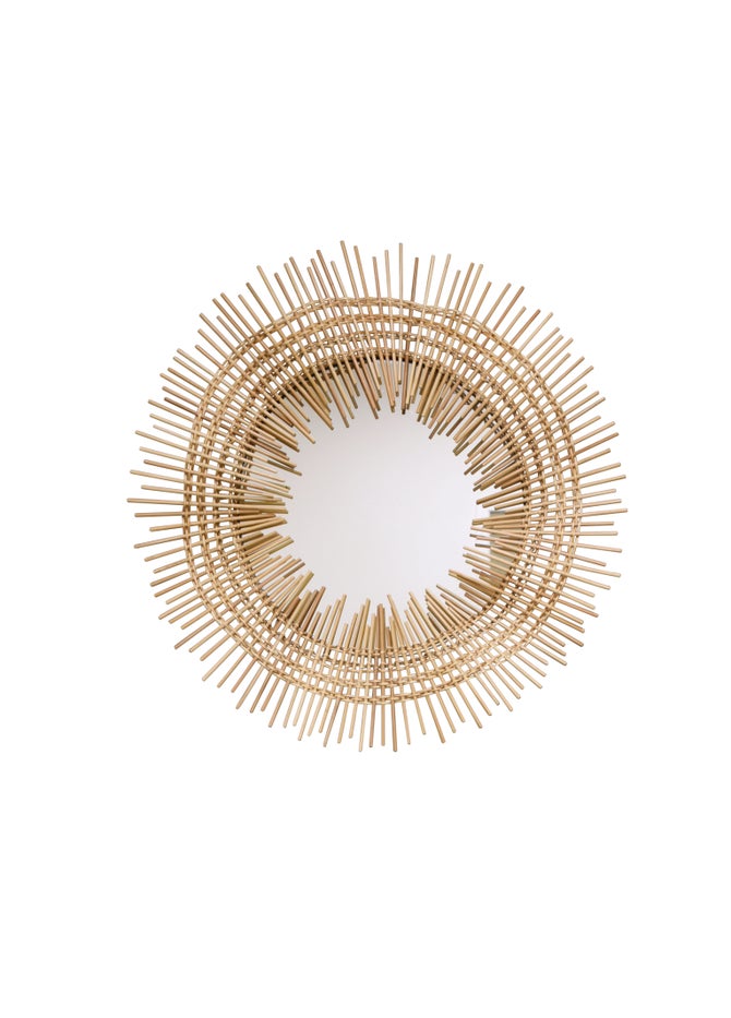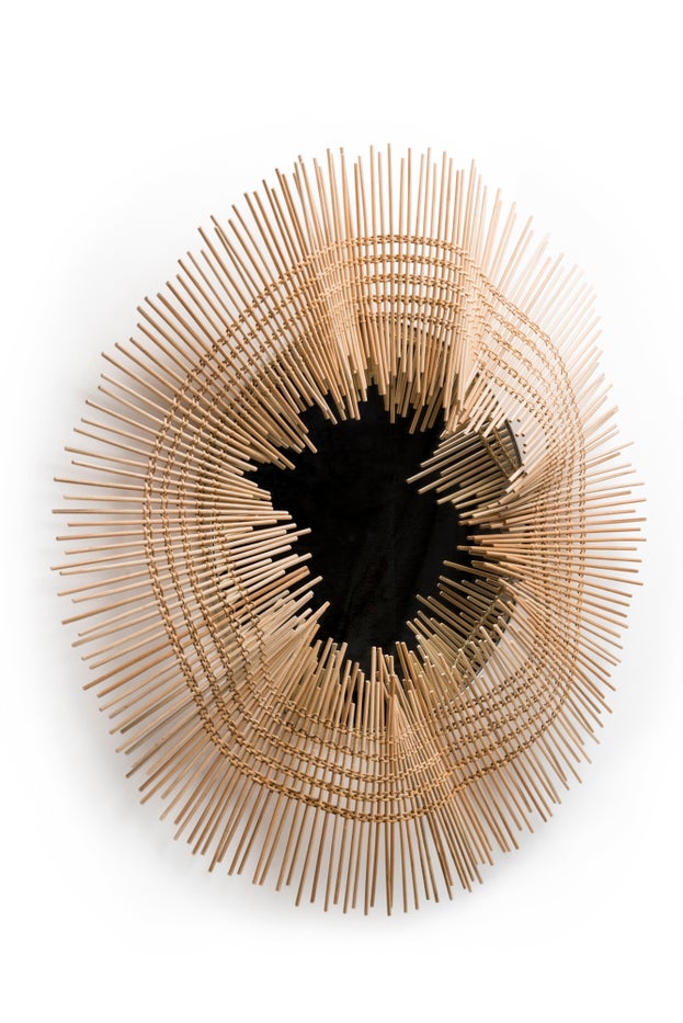 Like the rays of the sun, the Twiggy mirror by Kenneth Cobonpue is made of fine lines beaming from its center. Rattan spokes are woven over a steel frame, creating a radial pattern with gentle slopes.