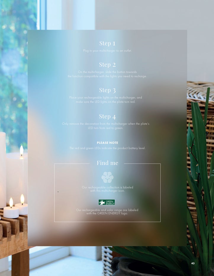 The DecoPower Multicharger makes it easy for you to light up night after night without having to worry about batteries. The charging station's discreet design fits in most places in your home, and makes it easily accessible for you to charge. Place the DecoPower Multicharger in your preferred location and connect to the provided USB charger. When the LED light on the charger lights up red, it is ready to charge your lights. Put the candles on the charging station and wait 2-5 hours. When the light is charged, the lamp will change from red to green. The Decopower Multicharger is not included with any rechargeable products. USB to USB C.