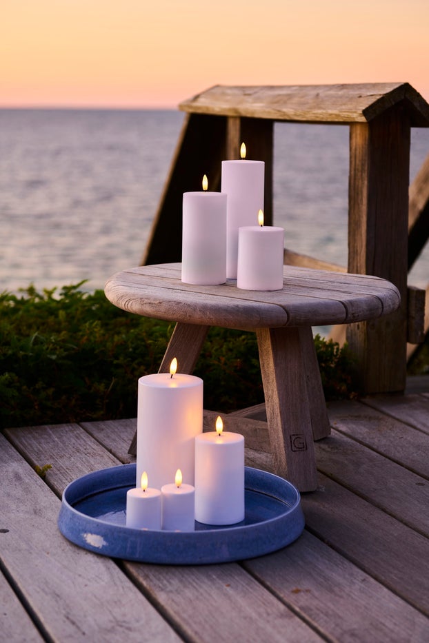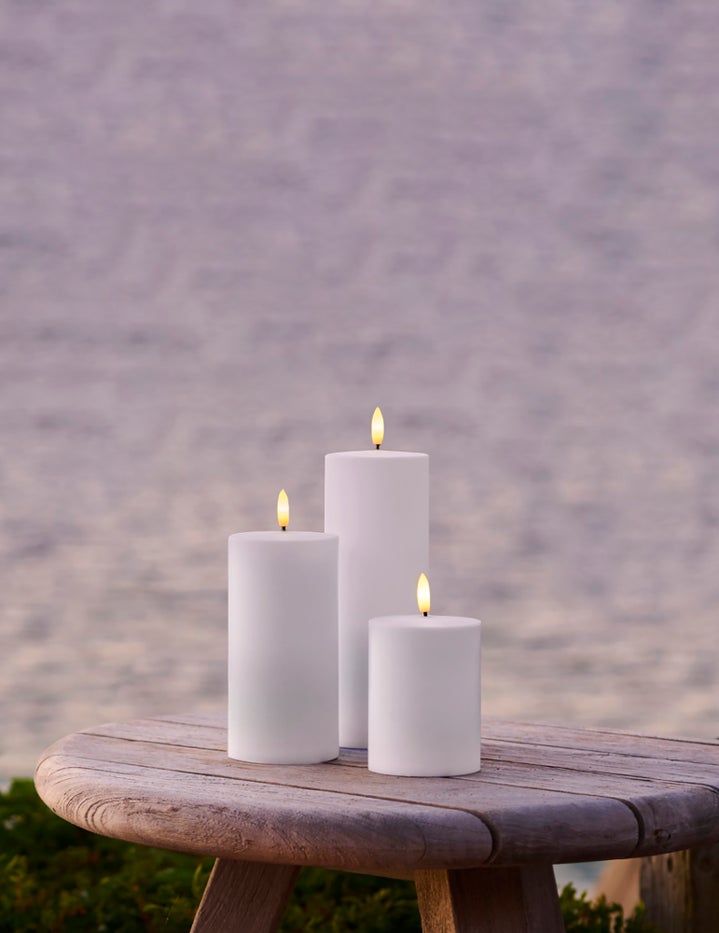 The Sille Outdoor are waterproof, with no risk of moisture damage They are designed heavier than other Sirius candles, to avoid falling over in the wind