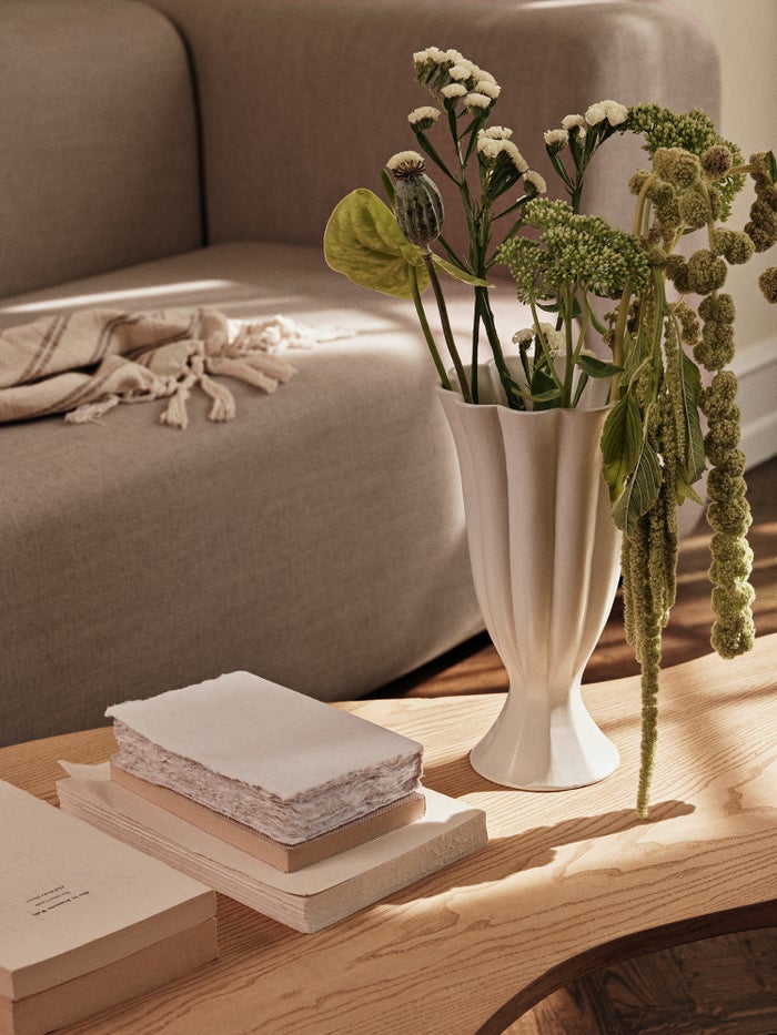 The Heli Vase from Broste Copenhagen stands elegantly on a small pedestal, featuring a graceful lily-inspired shape with delicate ribbed relief. Its timeless matte cream colour and refined design make it a versatile centrepiece, effortlessly complementing both lush, full bouquets and simple bundles of tulips. Made from partially recycled clay, it combines sustainability with modern sophistication, making it a beautiful addition to any home.