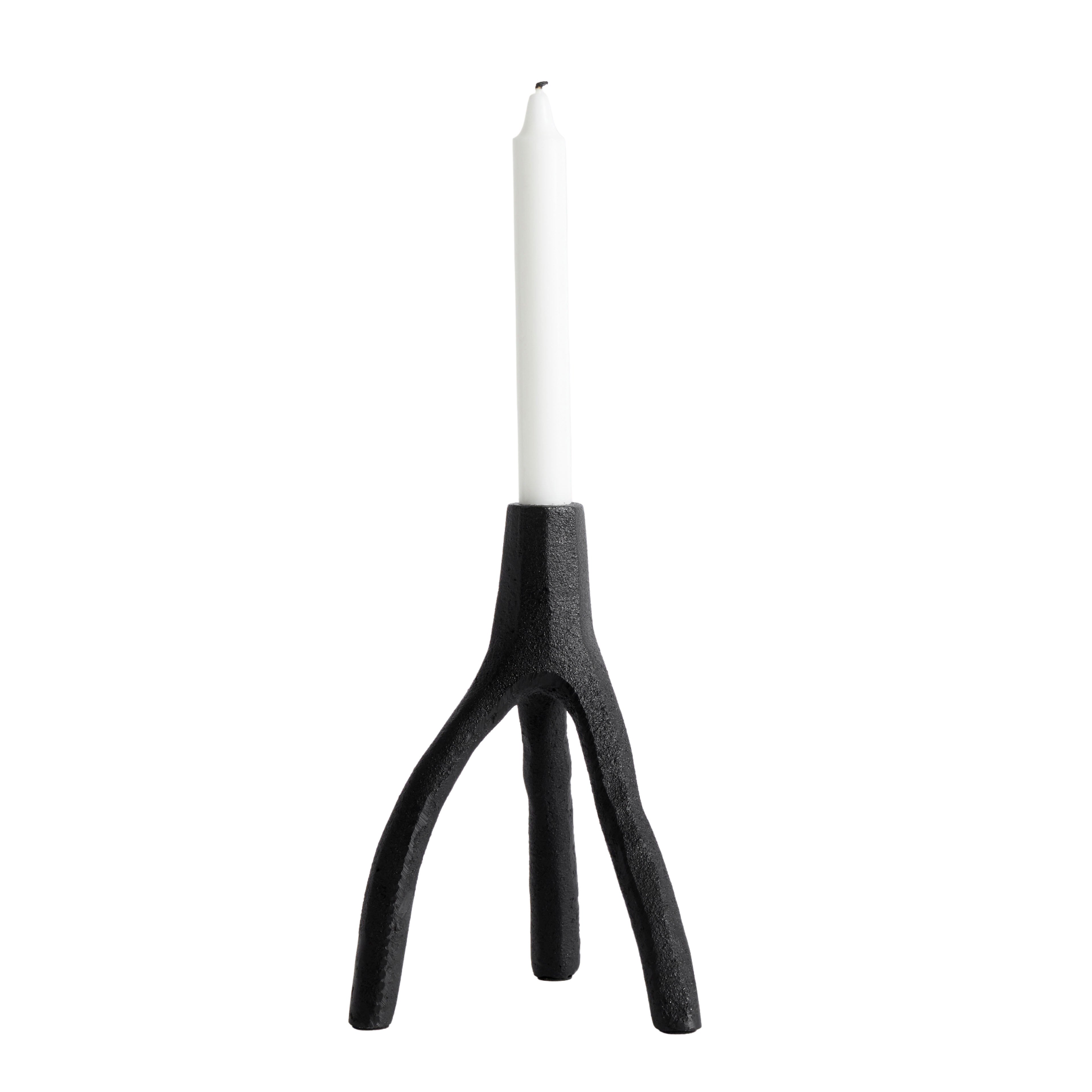 The Aion candleholder from Muubs is made from black painted cast iron. Inspired by nature and the form of tree branches, this unique candlestick is designed for crown candles. The original model was hand-shaped in clay by the designer, and the final piece was cast from this sculptural form