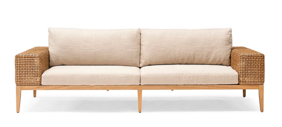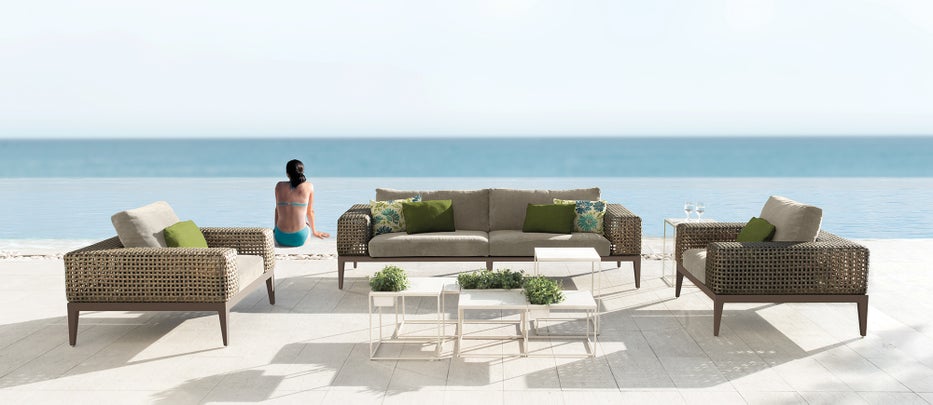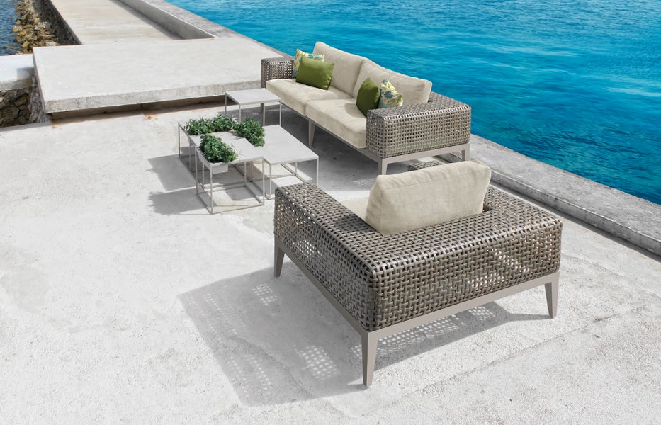 Oversized armrests made of thick woven rattan strips accentuate the minimalist silhouette of the Tropez collection. Understated details and clean lines create a comfortable range that is architectural in proportion and timeless in design. Each piece features spunbonded-covered, reticulated foam with upholstery in Sunbrella fabric, available in Canvas and Violetta Baltic.